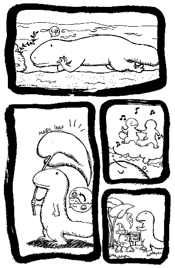 川の中のオオサンショウウオがMagic Shopで魔法の葉っぱを手に入れ、陸を歩けるようになるところです。全体的に平べったい感じですね〜。